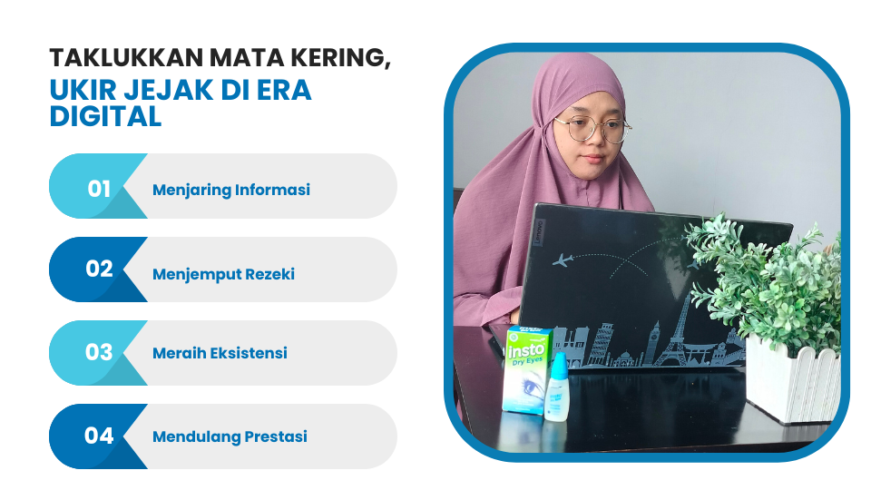 Dalam setiap pilihan pasti akan ada tantangan. Termasuk saat memilih berkecimpung di ranah digital savvy. Keluhan mata kering menjadi salah satu tantangan terbesar yang harus aku atasi. Hal ini dilakukan agar aku bisa lebih leluasa bergerak untuk mengukir jejak di era digital ini.